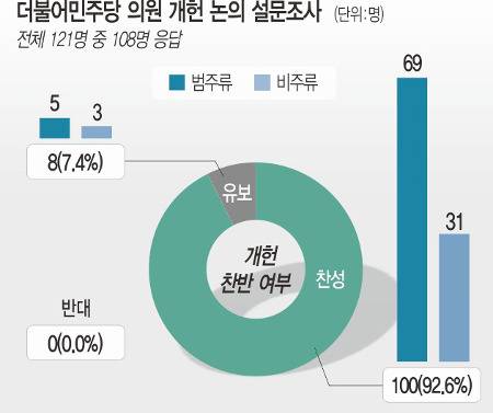 국민일보가 28일 민주당 의원 121명 중 108명을 대상으로 설문조사한 결과 77명(71.3%)이 차기 정부를 개헌 적기로 꼽았다. 이 중 상당수는 대통령 후보들이 개헌을 공약한 뒤 당선 후 추진해야 한다는 입장이었다.