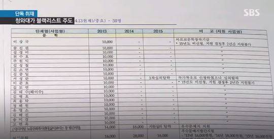 SBS는 지원 사업별로 블랙리스트에 오른 개인이나 단체들이 정리돼 있는 2014년과 2015년 문체부 블랙리스트 이른바 ‘정무 리스트’를 28일 공개했다.