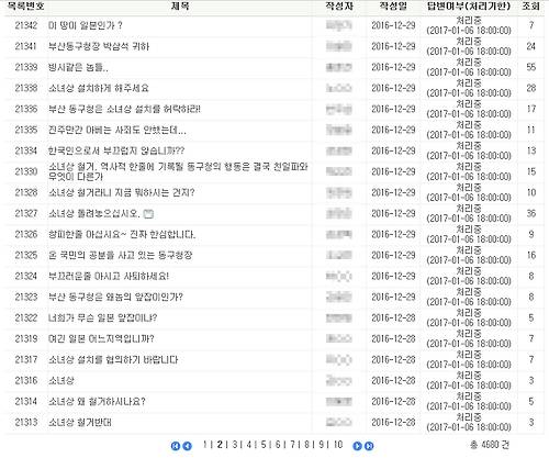 구청 홈페이지 '구청에 바란다' 게시판에는 28일부터 이틀간 구청의 소녀상 철거를 비판하는 80여 건의 글이 올라와 있다.
