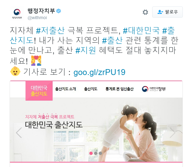 행정자치부는 243개 모든 지자체의 출산통계와 출산 지원 서비스를 국민이 쉽게 찾을 수 있도록 '대한민국 출산지도 (birth.korea.go.kr)' 홈페이지를 구축하고 오늘(29일)부터 서비스하기 시작했습니다.