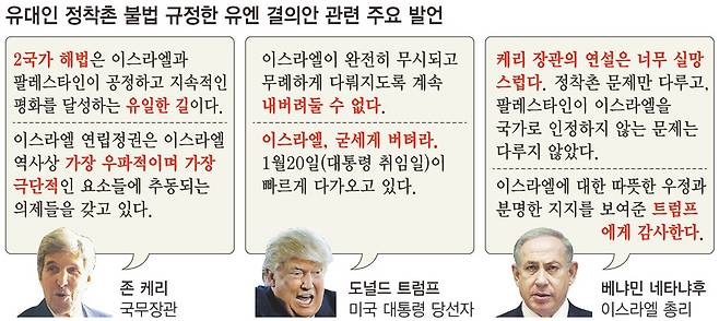 존 매케인 상원 군사위원장(공화당)도 케리 장관의 연설을 “기껏해야, 물러나는 행정부가 말년에 늘어놓는 초점 없는 장광설”이라고 폄하했다. 공화당은 다음달 트럼프 정부 출범에 맞춰, ‘유엔 규탄 결의안’과 ‘오바마 규제 백지화 법안’을 우선 처리하기로 가닥을 잡았다고 미 정치전문 매체 <폴리티코>가 28일 공화당 의회 소식통들을 인용해 보도했다.