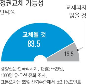 이념성향별로 보면 진보는 93.3%가 정권교체를 예상했고, 보수층에서도 65.6%였다. 더불어민주당(93.8%), 국민의당(92.8%), 정의당(92.2%) 등 야당 지지자들은 ‘확신’ 수준이었다.