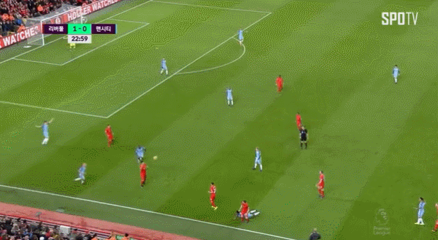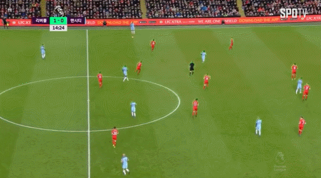 골이 필요한 쪽은 맨시티였지만 오히려 과르디올라는 먼저 변화를 주는 대신, 리버풀의 에너지가 떨어지는 시간을 기다리고 있었을지도 모른다. 실제로 후반 10분 이후 맨시티는 중원에서 전후 볼 소유 작업을 통해 공격의 활로를 만들어 나갔다. 리버풀의 에너지가 전반에 비해 조금씩 떨어지면서 간격이 벌어졌고 맨시티의 패스에도 생각이 담기기 시작했다.