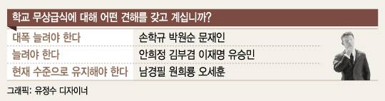 반면 남 지사는 "학교 무상급식은 해야 할 일이고 정치하는 사람들의 책임이지만 더 앞으로 나가는 보편적 복지는 국민적 합의를 거쳐 신중하게 해야 한다"는 '신중론'을 폈다. 또한 대다수의 주자들은 "아이들 밥먹는 문제를 더이상 정쟁의 수단으로 삼아서는 안 된다"고 입을 모았다.
