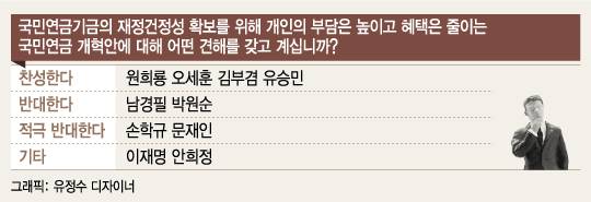 원 지사는 "미래세대에게 연금고갈의 부담은 떠넘겨서는 안 된다"고 밝혔으며, 김 의원도 "연금의 재정건전성을 위한 개혁은 한 번에 완성될 수 없고 연금의 재정건전성 확보와 더불어 연금이 노후대책 수단으로 굳건히 자리잡을 수 있도록 하는 개혁이 병행돼야 한다"고 말했다. 유 의원은 "국민연금 개혁에 찬성한다"면서도 "중요한 전제조건은 공무원연금을 개혁하는 것"이라고 강조했다.