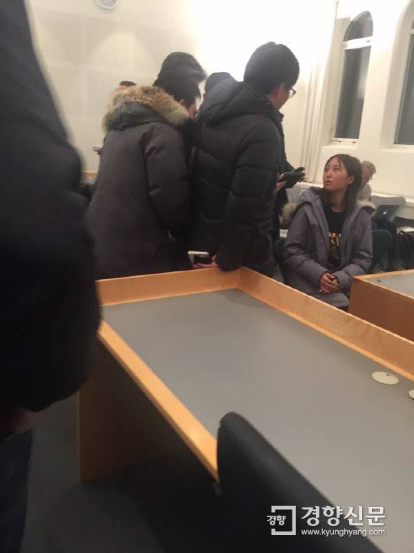 | 덴마크 올보르 법원에서 잠시 휴정중 기자들의 질문에 답변하는 정유라씨 사진=현지교민제공 |
