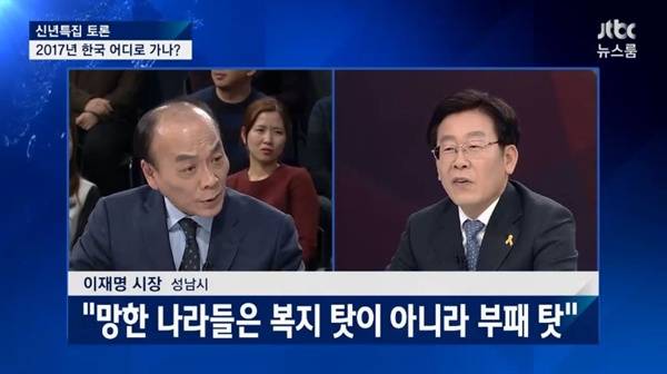 | ▲ JTBC 신년특집 대토론 '2017년 한국, 어디로 가나'의 한 장면. 전원책과 이재명의 충돌은 뜨거웠다. |