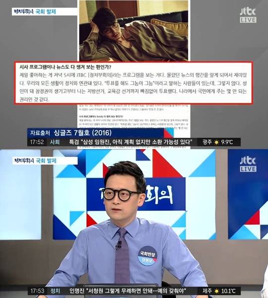 양원보 기자는 이에 "탤런트 이동욱이 가장 즐겨보는 프로그램이 '정치부회의'라고 한다. 포털 검색창에 이동욱 정치부회의를 넣어보면 아실거다"고 말했다.