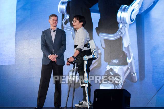 [ 라스베이거스, 미국(현지) - 2017/01/04 ] 현대자동차 현동진 책임 연구원이 웨어러블 로봇을 시연하고 있다.