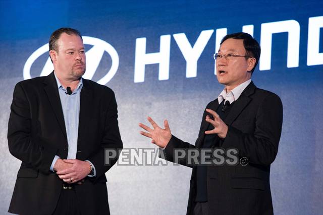 [ 라스베이거스, 미국(현지) - 2017/01/04 ] 현대차 IT총괄부사장 황승호와 제임스 피터스 시스코 자율주행 및 커넥티드카 담당 부사장이 커넥티드 카에 대해 설명하고 있다.