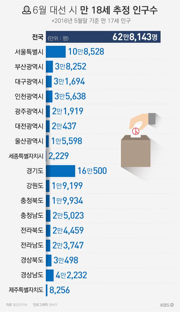 그리고 이는 행정자치부가 제공하는 주민등록 인구통계로 추정해볼 수 있다. 올해 5월 말 기준 만 18세 인구는 지난해 5월 말 기준 만 17세 인구라고 볼 수 있는데, 주민등록 기준 이 인원(거주자, 거주불명자, 재외국인 포함)이 62만8,143명이다.