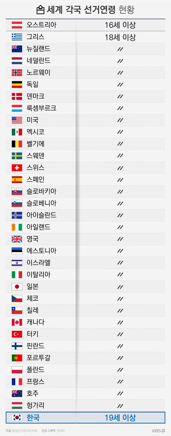 다른나라 상황은 어떨까. 지난해 8월 국회에 선거권자 연령을 19세에서 18세로 낮춰야 한다고 개정의견을 낸 중앙선거관리위원회에 따르면 현재 경제협력개발기구(OECD) 34개 회원국 중 한국을 제외한 모든 나라는 선거권자 연령 기준 나이가 만 18세 이하로 우리보다 낮다. 대부분 만 18세가 넘으면 투표할 수 있는데, 그중에서도 오스트리아는 만 16세 이상이면 투표가 가능하다.