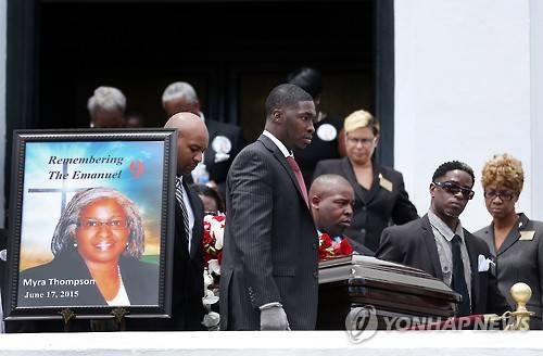 FILE -In this Monday, June 29, 2015 file photo, pallbearers carry the casket of Myra Thompson from the sanctuary at Emanuel African Methodist Episcopal Church after her funeral services in Charleston, S.C. Thompson, 59, was one of nine killed in a shooting during Bible study at the church. During Dylan Roof's sentencing for friends and family members walked up to the witness stand and testified about the nine black church members gunned down during a Bible study. The testimony came during the sentencing phase of Dylann Roof's death penalty trial. (Grace Beahm/The Post And Courier via AP)