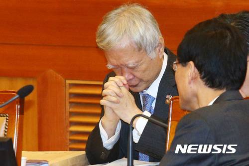 【서울=뉴시스】5일 오전 서울 종로구 재동 헌법재판소 대심판정에서 열린 박근혜 대통령 탄핵심판 사건 2차 변론기일에서 박 대통령 변호인단의 서석구 변호사가 재판 시작을 앞두고 기도하고 있다. 2017.01.06.