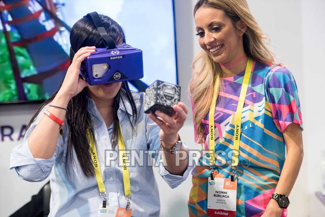LAS VEGAS, NEVADA USA JANUARY 7, 2017: Ivonne Burciaga, Merge Virtual Reality, guides Li-Jay Chu, Cyrpress, California, in a demonstration of Merge Virtual Reality's VR Goggles and Holo Cube at CES 2017 in Las Vegas, Nevada, USA on January 7, 2017.