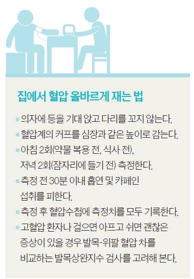 그러나 고혈압 환자라면 얘기가 다르다. 날마다 혹은 아침저녁으로 들쑥날쑥하다면 문제가 있다는 얘기다. 특히 매일 재는데도 혈압 변동 폭이 15㎜Hg 이상이면 조치가 필요하다. 김진권 교수는 “혈압 변화의 폭이 크다는 건 혈압 조절이 안 되고 있다는 증거”라며 “심장병, 뇌졸중 발생 위험이 크다는 의미이기 때문에 복용 중인 혈압약을 점검해 봐야 한다”고 조언했다.