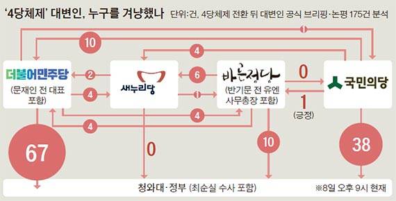 바른정당도 국민의당에 대한 브리핑은 1건도 내놓지 않았다. 대신 23건의 브리핑 중에서 청와대를 비판하는 브리핑이 10건(43.5%)으로 가장 많았다. 바른정당 역시 정부 여당과는 선을 긋고 국민의당과 제3지대에 대해 열린 자세를 취하겠다는 전략을 세우고 있는 셈이다. 이정희 한국외대 정치외교학과 교수는 “대선을 앞두고 열세에 있는 두 당의 ‘반문 연대’ 구상에 대한 공통된 의식이 반영된 결과”라고 말했다.