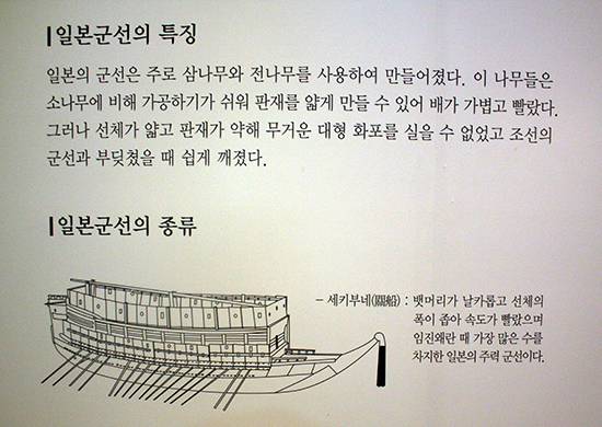| ▲ 일본 전함의 특징은 '가볍고 빠르다, 그러나 충돌에 약하다.' (충무공이순신기념관 게시 그림) |