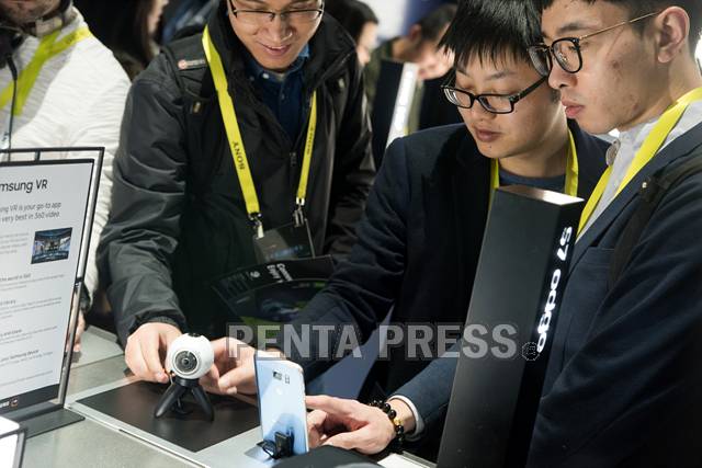 [ 라스베이거스, 미국(현지) - 2017/01/07 ] CES 2017 행사장 삼성 부스에서 참가자들이 기어360과 갤럭시s7의 연동을 시험하고 있다.