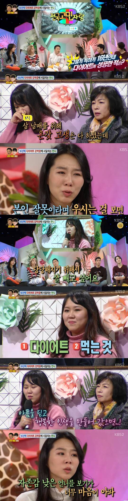 MC들은 "자존감을 좀 회복했으면 좋겠다. 살찐 것 때문에 헤어지자는 남자는 잊어버려라. 아버지가 강요한 인생 대신 내 인생을 살았으면 좋겠다"고 격려했다.
