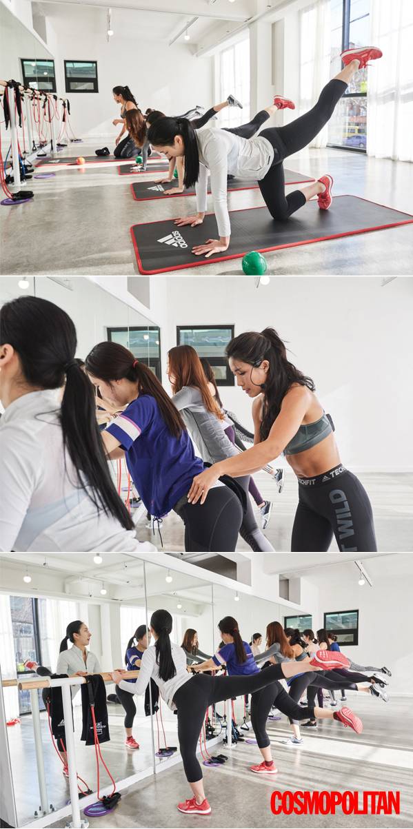 (위에서부터)1 코어와 하체 라인을 잡아주는 ‘LINDASCULPT’ 클래스. 2 골반이 흐트러지지 않도록 자세를 교정해주는 린다. 3 다리를 뒤로 힘껏 차 올리면 탄탄 매끈한 뒤태 미녀로 변신!
