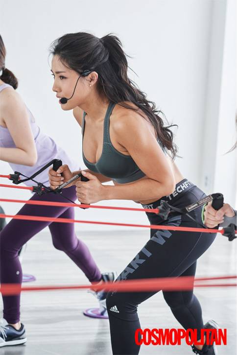 지난 인터뷰 후 5개월 만이네요. 그사이에 보디라인이 더 예뻐졌어요.그사이에 운동 방법을 변경했거든요. 요즘엔 머신을 사용하면서 근육을 키우는 무산소 운동은 쉬고, 내 몸을 이용하는 동작 위주로 운동하고 있어요. 필라테스 동작에 소도구를 이용한 웨이트를 접목하거나 웨이트 동작을 변형해 근육의 모양을 잡는 거죠. 근육을 조이고 늘리면서 크기를 키우는 게 아니라, 다양한 동작이 끊임없이 이어지도록 운동하다 보니 보디라인이 탄탄하면서도 여성적으로 바뀐 것 같아요.