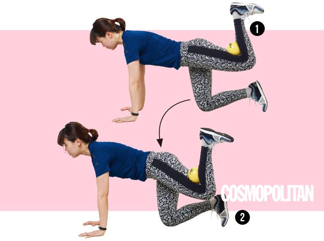 엉덩이 근육 쪼이기 1. 양손과 양 무릎을 어깨너비로 벌려 바닥에 댄 다음 작은 고무 볼을 왼쪽 무릎 뒤에 끼운다. 무릎에 끼운 공이 빠지지 않도록 힘을 꽉 주면서 다리를 위로 들어 올린 다음 처음 자세로 복귀. 2. 왼쪽 다리를 옆으로 힘껏 차며 벌린다. 이때 왼쪽 무릎 뒤에 끼운 공이 빠지지 않도록 꽉 쥐고, 엉덩이 근육이 조이는 것을 느끼며 운동할 것. 20회씩 3세트, 양쪽 모두 반복.