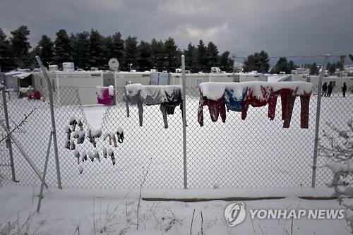 Laundry of Syrian refugees is covered with snow while hung on a fence at the refugee camp of Ritsona about 86 kilometers (53 miles) north of Athens, Tuesday, Jan. 10, 2017. The European Commission said conditions for refugees on islands and other camps where they are housed in tents despite severe cold weather, is "untenable." (AP Photo/Muhammed Muheisen)