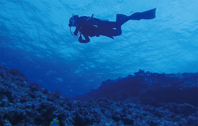 첫날 다이빙은 50인승 다이빙 전용선으로 나하항을 출발해 케라마 제도 서쪽 끝에 위치한 구바섬(久場島)에서 시작했다. 야자수가 늘어선 풍경이 아니라 암석으로 이루어진 섬 풍경은 색다른 ‘탐사 분위기’를 고조시켜 주었다. 30명이 넘는 다이버들이 팀별로 입수한 후 우리도 첫 포인트를 향해 물속으로 뛰어들었다. 시작부터 감탄의 연속이었다. 맑고 깨끗한 수중에서 다이버들을 맞이한 것은 두 개의 거대한 바위였다. 다이버들을 압도하는 돌덩어리의 위아래를 유영하며 오르내리는 느낌은 마치 거대한 해저 유적지의 입구에 도착한 탐사대의 경외감과 다름없었다.