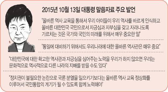 박 대통령은 당시 한·미 정상회담 출국 직전 회의를 열고, 최대 이슈였던 국정 교과서 정책에 대해 처음 언급했다. “올바른 역사 교육을 통해 대한민국 국민으로서 자긍심을 갖고 자라도록 가르쳐야 한다” “확고한 역사관과 자긍심을 심어주는 노력을 하지 않으면 우리는 문화적으로 역사적으로 다른 나라의 지배를 받을 수도 있다” 등의 발언을 했다. 특검팀 관계자는 구체적 문장을 특정하진 않았지만 “발언 중 역사관을 언급한 부분 등이 수정됐다”고 말했다.