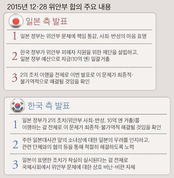 ‘최종적’이란 표현은 일본의 요구였다. 미국의 영향도 있었다. 일본은 2012년 말 아베 정부 출범 이후로 워싱턴 조야에 “우리가 아무리 사과를 해도 한국이 골포스트를 옮기는 것처럼 말을 바꾼다”는 일명 ‘골포스트론’을 퍼뜨렸다. 이에 미국은 합의 전 한국 측에 “사죄, 책임 인정 부분에서 진전이 있으면 일본이 원하는 최종적 해결임을 확인해줘도 좋지 않겠느냐”는 메시지를 전했다고 한다.