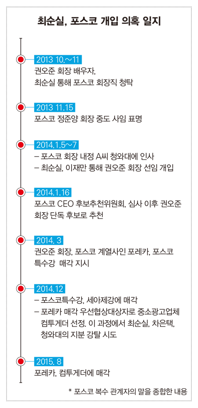 하지만 관계자들은 “포레카 매각에는 ‘일감 몰아주기’ 해소가 아닌 다른 이유가 있었다”고 말한다. 포스코 전직 임원은 “청와대가 권 회장을 선임하며 계열사 사장 자리 몇 개를 요구했다. 그중 하나가 포레카”라고 했다. 최씨 측이 포레카 매각 전부터 자신의 사람을 계열사에 배치한 뒤 포레카를 차지하려 했다는 주장이다. 실제로 2014년 3월 이후 임명된 일부 임직원은 ‘최순실·차은택 라인’이라는 의혹을 받기도 했다. 매각 직전까지 포레카 사장으로 재직했던 김영수 전 대표는 최순실씨의 핵심 측근이었다.