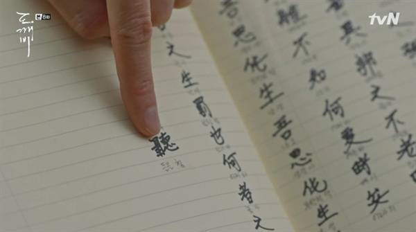 | ▲ 은탁이 김신의 손바닥에 '들을 청'을 적고 있다. |