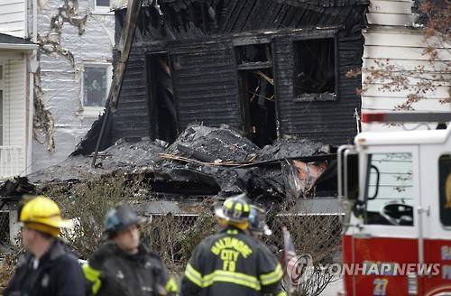 Debris from an early morning house fire is seen past fire officials in Baltimore, Thursday, Jan. 12, 2017. A woman and three children in the house were injured and six more children in the family are unaccounted for, a fire official said Thursday. (AP Photo/Patrick Semansky)