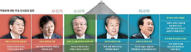다만 바른정당과 국민의당 내엔 빅텐트의 필요성에 공감한다는 의원이 상당수다. 바른정당 김무성 의원은 이날 기자들과 만나 “반 전 총장이 입당해 우리 당의 후보가 되기를 바란다”고 말했다. 바른정당 중심의 빅텐트를 염두에 둔 발언이다. 국민의당 박지원 전 원내대표도 “플랫폼 정당인 국민의당에 들어와 안철수·천정배 전 국민의당 대표, 손학규 전 대표, 정운찬 전 총리 등과 강한 경선을 했으면 좋겠다”고 했다.
