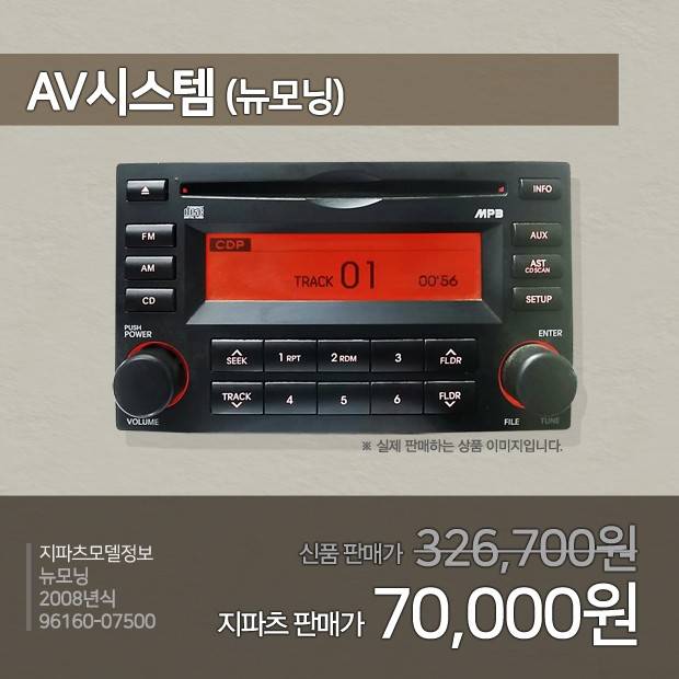 뉴모닝 2008년식 96160-07500 모델의 AV시스템은 신품 판매가가 326,700원이지만 지파츠 판매가는 70,000원입니다. ※ 실제 판매하는 상품 이미지입니다.