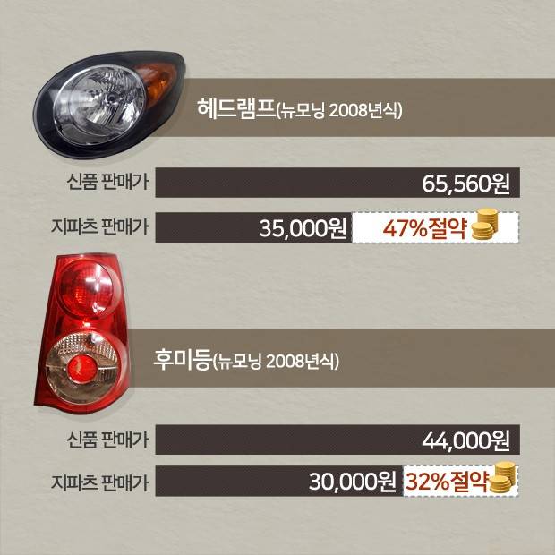 뉴모닝 2008년식 헤드램프는 신품 판매가는 65,560원이지만 지파츠 판매가는 35,000원으로 47% 절약된 가격입니다.