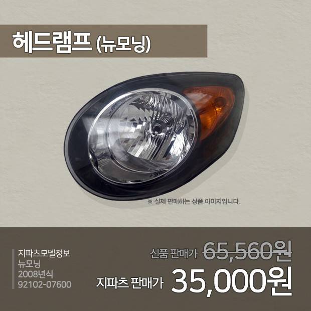 뉴모닝 2008년식 92102-07600 모델의 헤드램프는 신품 판매가가 65.560원이지만 지파츠 판매가는 35,000원입니다. ※ 실제 판매하는 상품 이미지입니다.