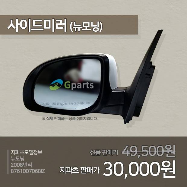 뉴모닝 2008년식 8761007068IZ 모델의 사이드미러는 신품 판매가는 49,500원이지만 지파츠 판매가는 30,000원입니다. ※ 실제 판매하는 상품 이미지입니다.
