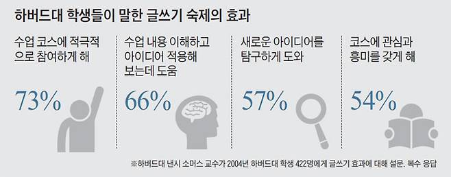 글쓰기가 중요하다는 인식은 대학 졸업 후에도 계속되는 것으로 나타났다. 하버드대 로빈 워드 박사가 1977년 이후 하버드를 졸업해 40대에 접어든 졸업생 1600명을 대상으로 '당신의 현재 일에서 가장 중요한 것이 무엇인가'를 물었는데, 90% 이상이 '글쓰기'라고 답했다. 그만큼 사회에 나가서도 글쓰기 능력이 중요하다고 느끼는 것이다.