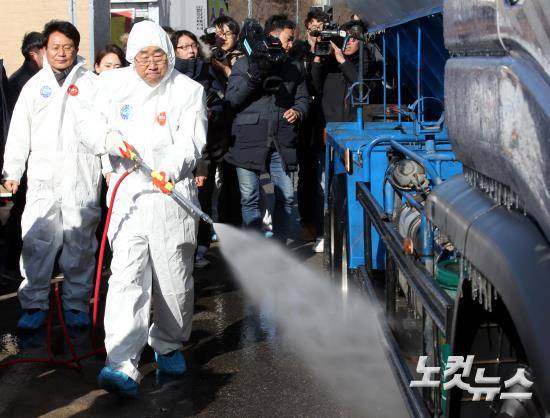 반기문 전 유엔 사무총장이 14일 오후 충북 음성군 맹동면의 한 조류인플루엔자(AI) 거점소독소를 방문해 고압소독기로 방역작업을 체험하고 있다.