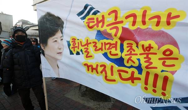 | ▲ 보수단체 '태극기가 휘날리며 촛불은 꺼진다' 14일 오후 서울 종로구 대학로에서 박사모 주축으로 구성된 '대통령 탄핵기각을 위한 국민총궐기운동본부' 주최로 열린 박근혜 대통령 탄핵반대 집회에 참석한 한 시민이 대통령 탄핵 반대하는 현수막을 들어보이고 있다. |
