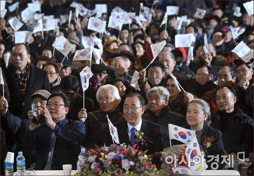 [충주=아시아경제 윤동주 기자] 반기문 전 유엔 사무총장이 14일 충주시 실내체육관에서 열린 '반 총장 귀국 환영대회'에 참석, 태극기를 흔들고 있다.