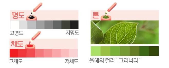 예를 들어 2017년 컬러 전문 기업 '팬톤(PANTONE)'에서 뽑은 올해의 컬러 '그리너리'는 채도는 낮지만, 명도는 높은 '밝고 부드러운 톤의 초록'입니다.