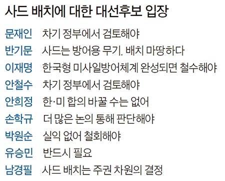 반면 반기문 전 유엔 사무총장이나 바른정당 유승민 의원 등은 사드에 관해선 입장이 분명하다.