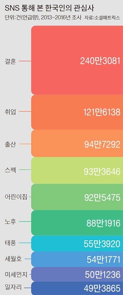 송길영 다음소프트 부사장이 전하는 ‘빅데이터 민심’은 이렇게 요약된다. 송 부사장은 2013년부터 4년간 소셜네트워크서비스(SNS) 등에 올라온 블로그 포스트 5억8400 만 건을 분석해 13일 ‘리셋 코리아: 내가 바꾸는 대한민국’ 행사에서 발표했다. 그는 먼저 SNS 글에서 ‘행복·만족’과 ‘고민·걱정’을 반영하는 단어의 출현 빈도를 비교했다. 그 결과 고민·걱정 등 부정적인 감성이 전체의 65% 정도를 차지했다. 고민·걱정의 대상은 크게 세 가지였다. 취업과 결혼·출산이다. 노후 걱정은 전체의 3%에 불과했다.