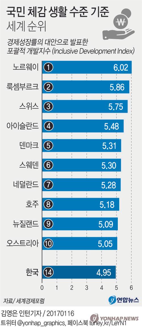 국가별 경제성장을 국내총생산(GDP)이 아닌 국민이 체감하는 생활 수준을 기준으로 측정한다면 한국의 순위는 세계 14위라고 세계경제포럼(WEF)이 추산했다.