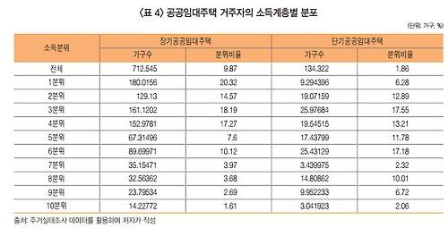 분석 결과 장기공공임대주택 거주자 중 소득 6분위 이상이 전체의 22%를 차지했다.