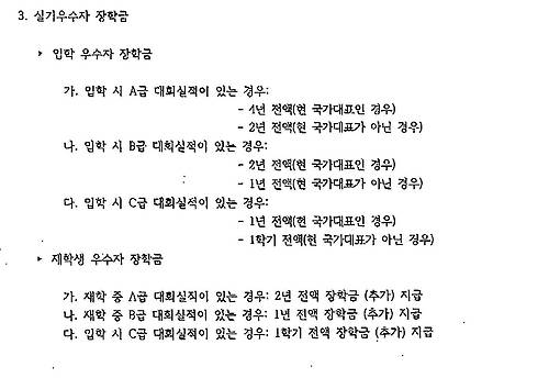 이 내규는 정 씨처럼 실기우수자로 입학한 학생들의 경우 담당교수 재량의 다양한 과제물로 중간고사와 기말고사를 대체할 수 있도록 하고, 입학시 C급 대회실적(하계 동계 전국체육대회, 협회장기대회, 문화체육관광부장관급 대회 3위 이상)만 있어도 장학금을 지급하는 파격적인 내용을 담고 있다.