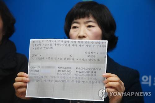 (창원=연합뉴스) 김선경 기자 = 18일 오전 경남도의회 브리핑룸에서 일본군위안부할머니와함께하는 통영거제시민모임 등이 기자회견을 열고 "화해치유재단이 당사자인 김복득 할머니 모르게 (가족에게) 위안부 피해 위로금(1억원)을 지급했다"며 비판하고 있다. 사진은 송도자 통영거제시민모임 상임대표가 총 1억원이 입금된 조카 명의 통장을 들어보이는 모습. 2017.1.18